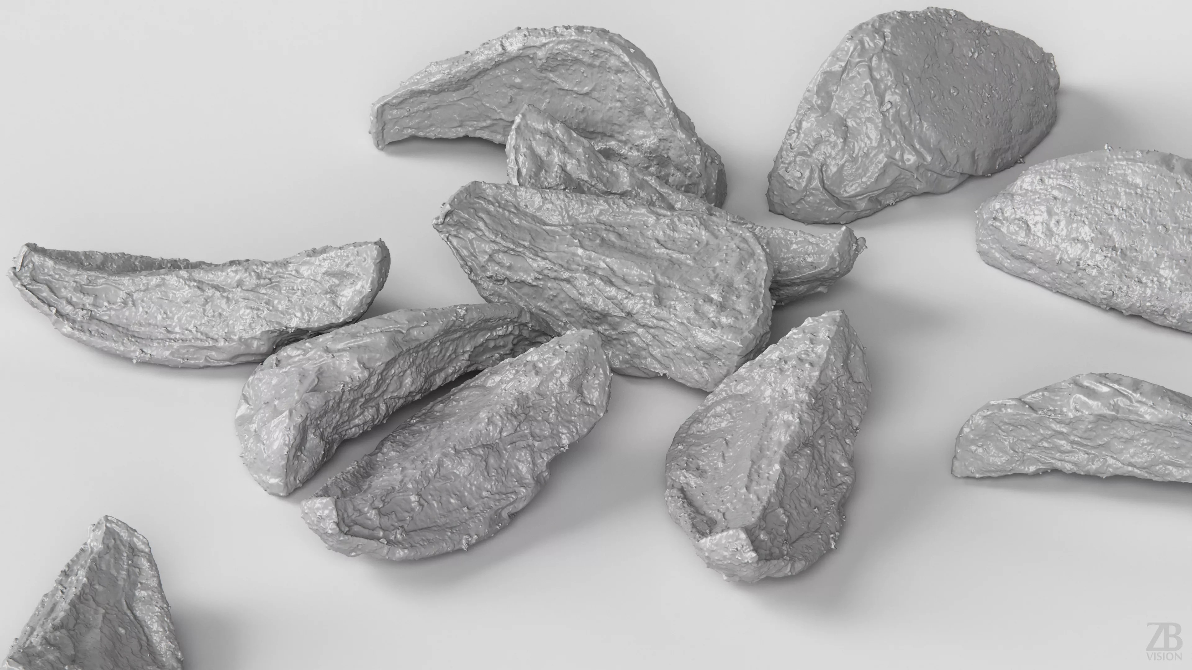 6 maps are supplied with this model. Textures supplied are in JPG format and are in 2K, 4K, and 8K resolution. The texture maps include ao, diffuse, glossiness, roughness, normal, and displacement(tif). The baked potato model is uvw unwrapped. 16K diffuse included.