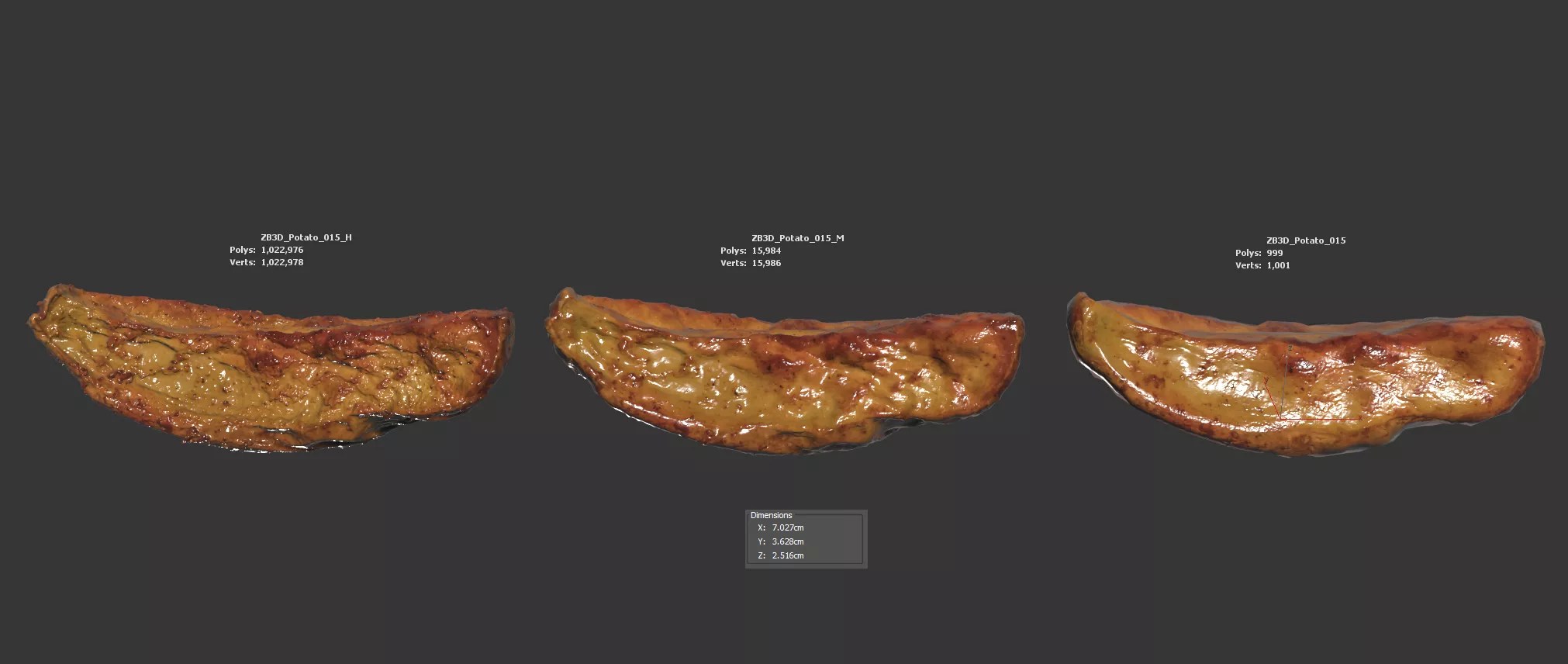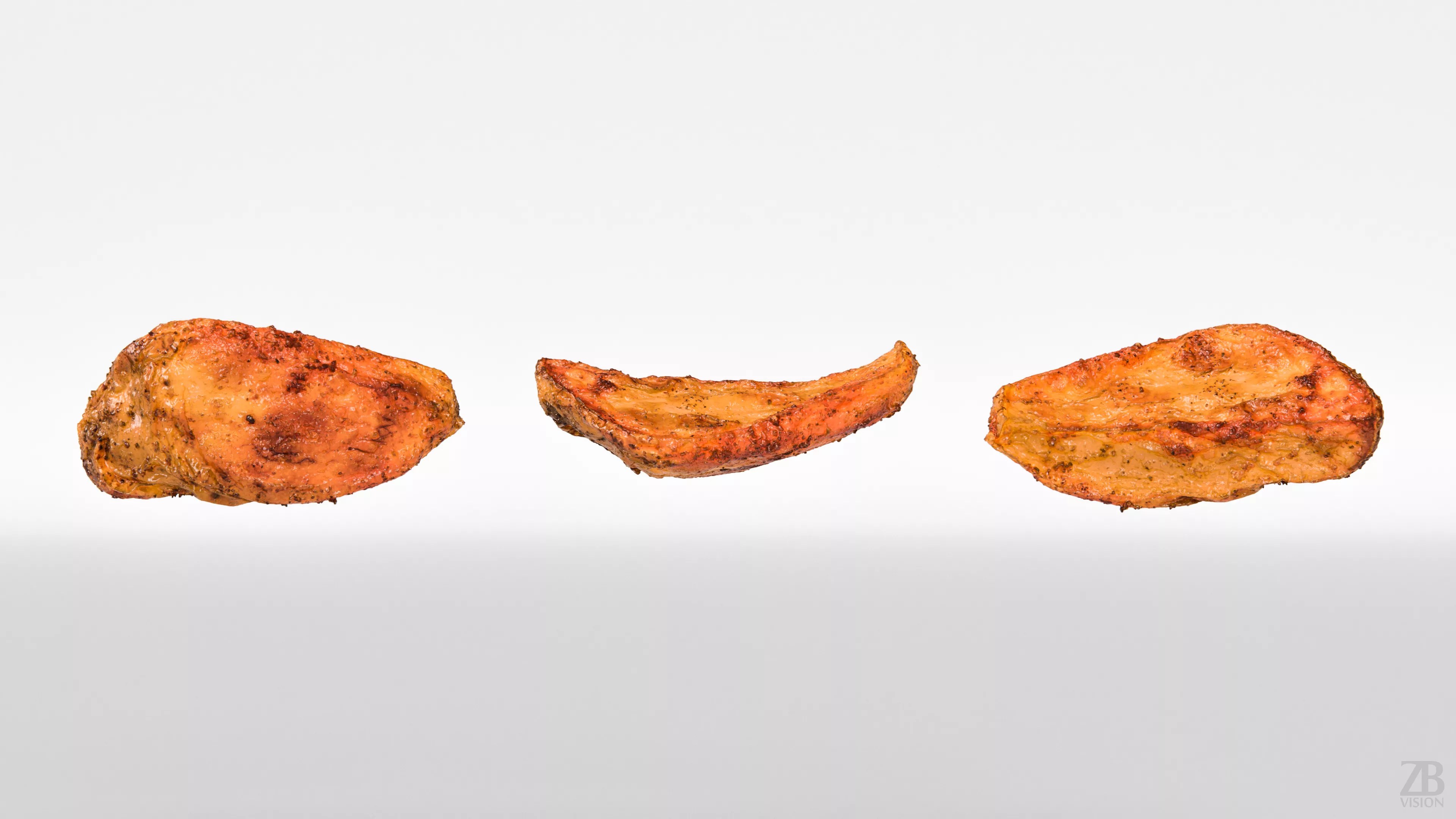 The baked potato model is presented as a single mesh in 3 subdivision levels: low, mid, and high. Meshes are quad-based. The polycounts are 999, 15K, and 1022K. The high-detail model is included in .max, .fbx, and .obj formats.