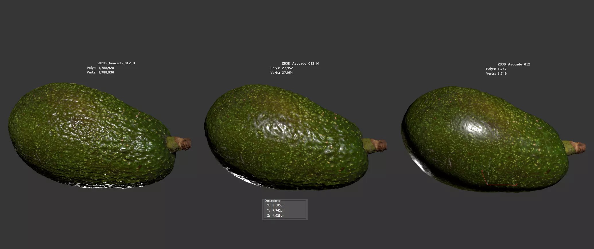 The avocado model is presented as a single mesh in 3 subdivision levels: low, mid, and high. Meshes are quad-based. The polycounts are 1K, 27K, and 1788K. The high-detail model is included in .max, .fbx, and .obj formats.