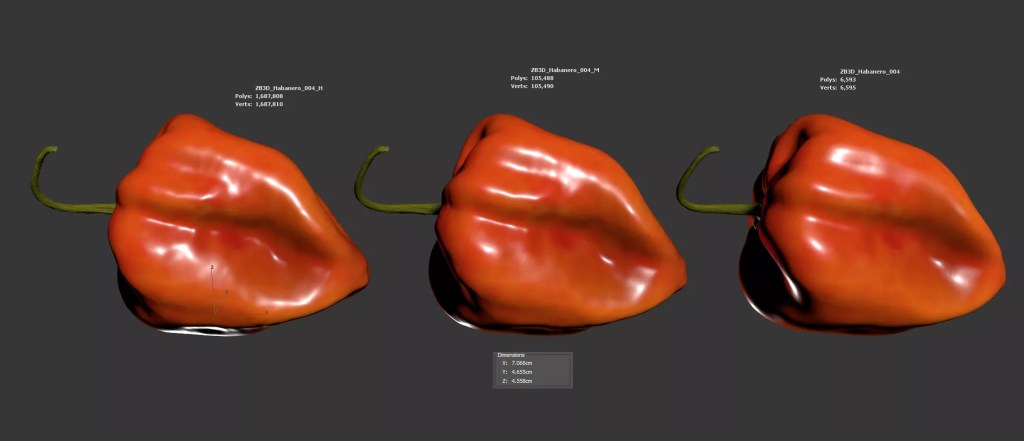The habanero model is presented as a single mesh in 3 subdivision levels: low, mid, and high. Meshes are quad-based. The polycounts are 6K, 105K, and 1687K. The high-detail model is included in .max, .fbx, and .obj formats.