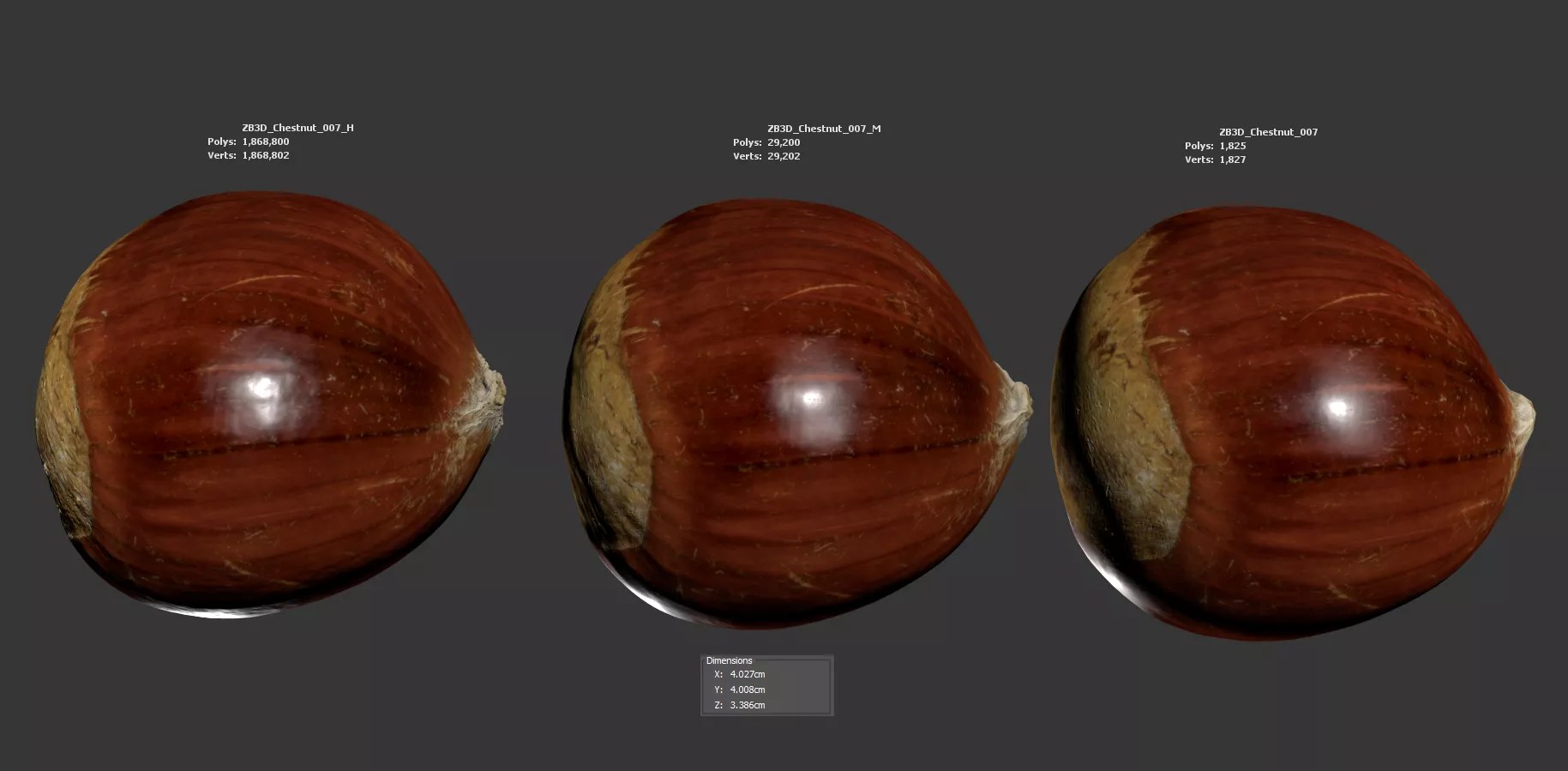 The chestnut model is presented as a single mesh in 3 subdivision levels: low, mid, and high. Meshes are quad-based. The polycounts are 2K, 29K, and 1868K. The high-detail model is included in .max, .fbx, and .obj formats.