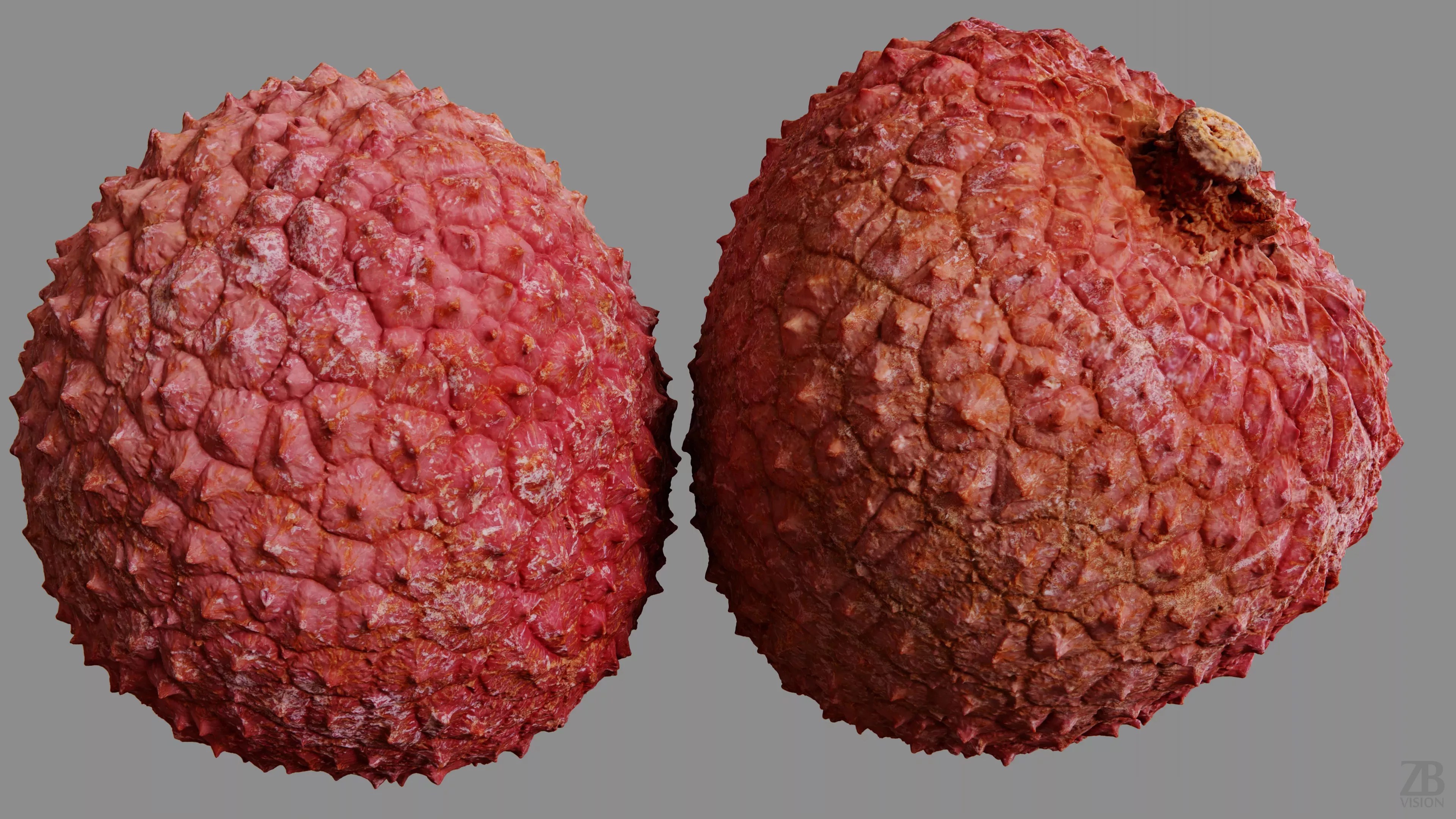 The litchi model is presented as a single mesh in 3 subdivision levels: low, mid, and high. Meshes are quad-based. The polycounts are 2K, 29K, and 1883K. The high-detail model is included in .max, .fbx, and .obj formats.