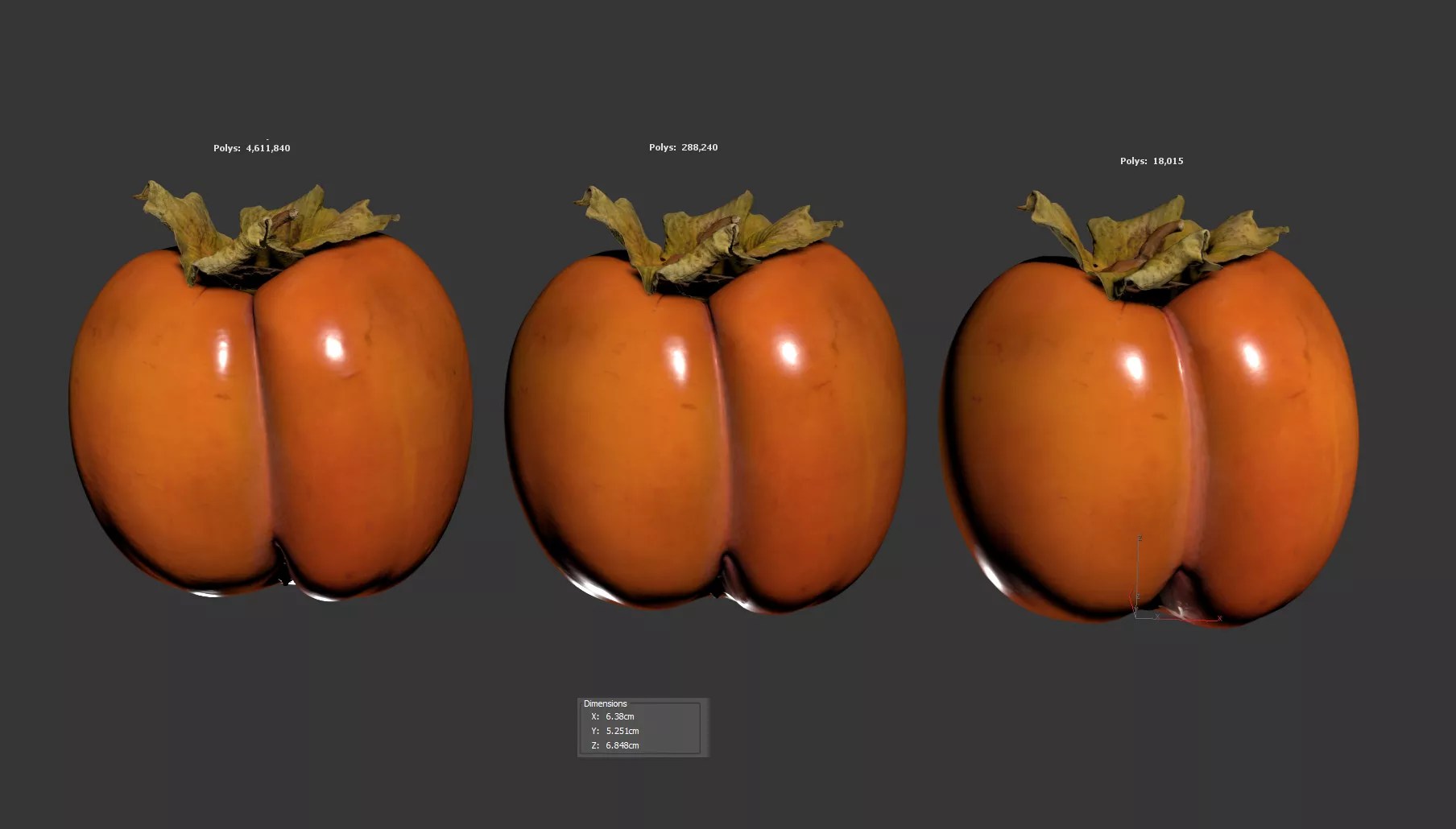 Enhance your visualizations, product designs, or still-life projects with this ultra-realistic 3D persimmon model. Meticulously photogrammetry scanned and textured, it boasts multiple levels of detail (18K, 288K, 4611K polycounts) for close-ups and broader scenes.