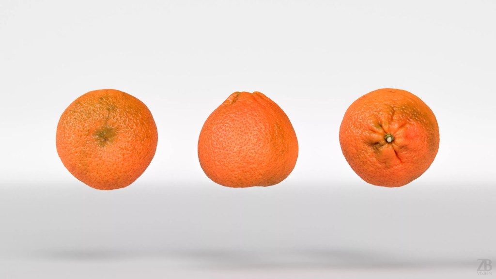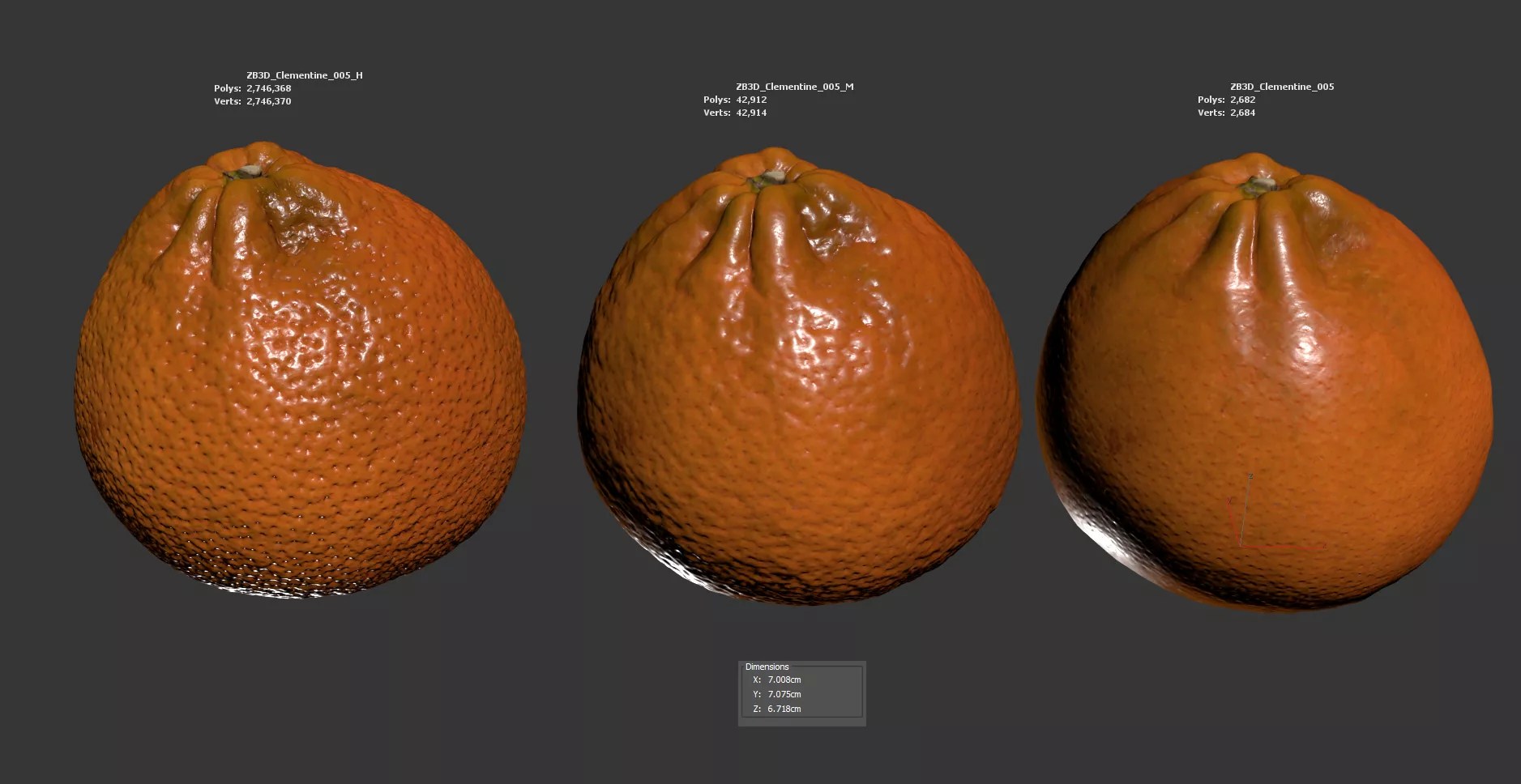 The clementine model is presented as a single mesh in 3 subdivision levels: low, mid, and high. Meshes are quad-based. The polycounts are 2K, 42K, and 2746K. The high-detail model is included in .max, .fbx, and .obj formats.