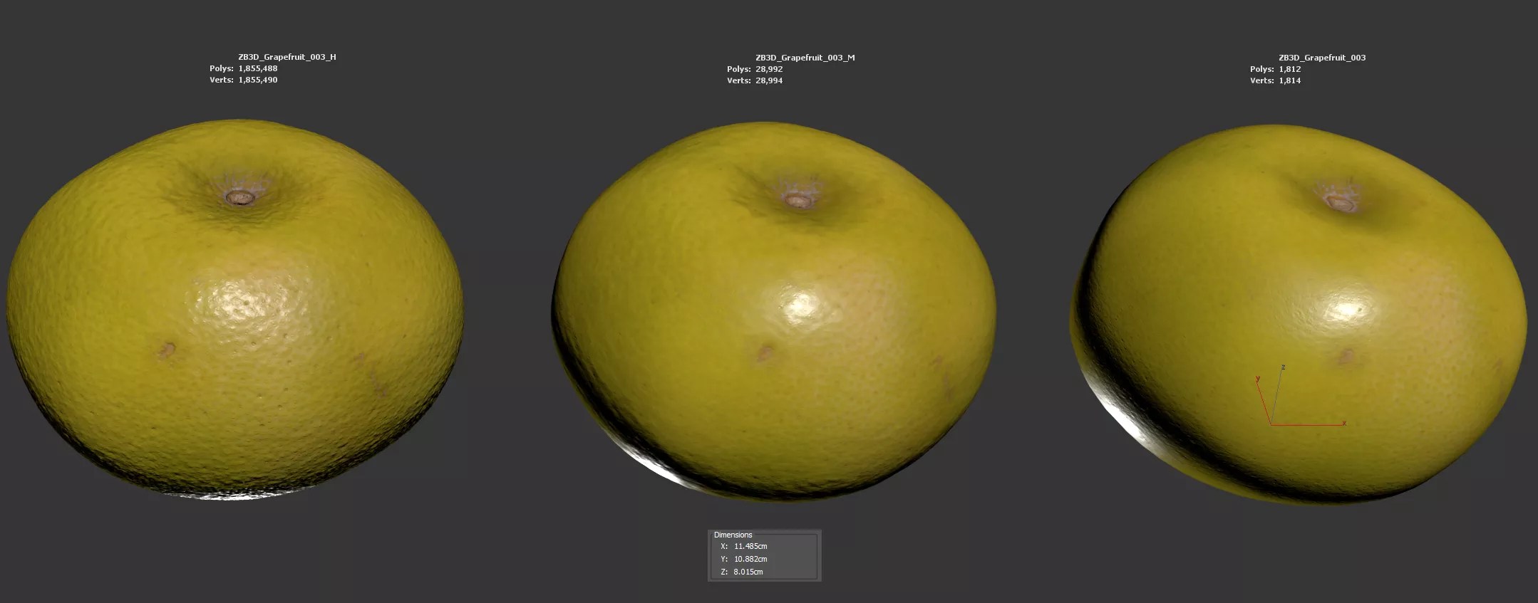 The grapefruit model is presented as a single mesh in 3 subdivision levels: low, mid, and high. Meshes are quad-based. The polycounts are 1K, 28K, and 1855K. The high-detail model is included in .max, .fbx, and .obj formats.