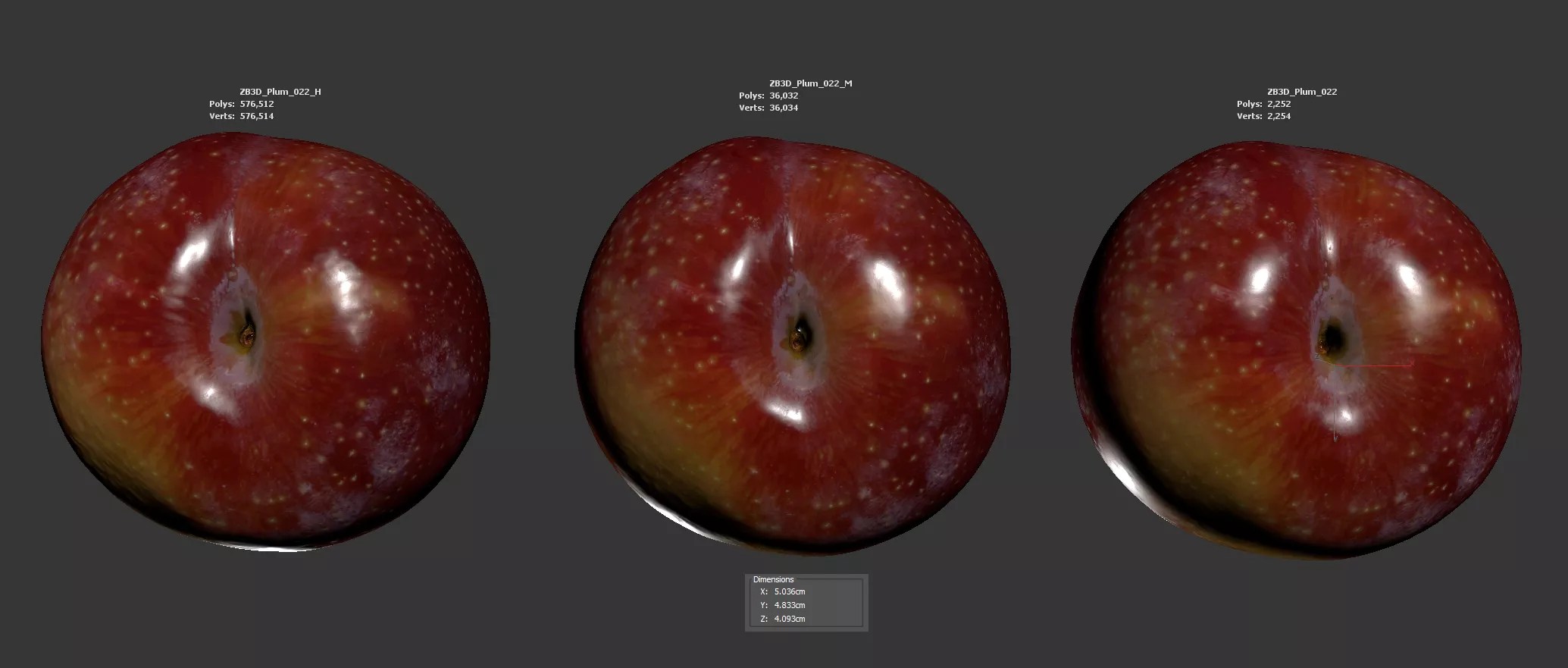 Enhance your food visualizations, product designs, or still-life projects with this ultra-realistic 3D plum model. Meticulously photogrammetry scanned and textured, it boasts multiple levels of detail (2K, 36K, 576K polycounts) for close-ups and broader scenes.