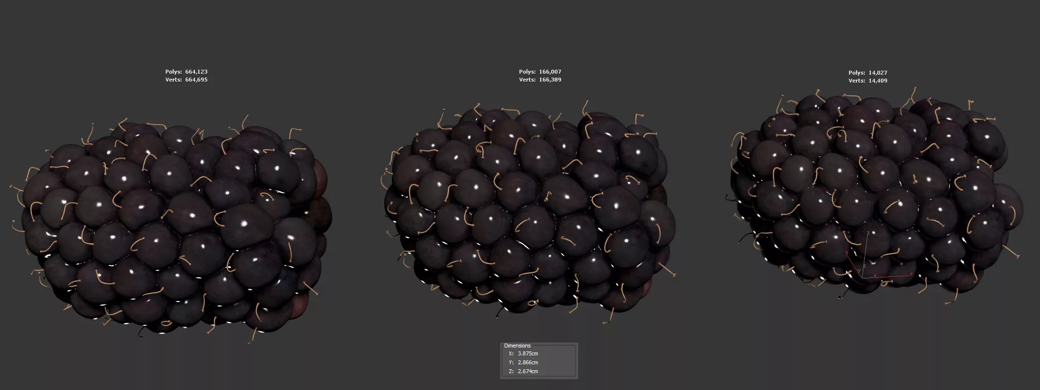 Enhance your food visualizations, product designs, or still-life projects with this ultra-realistic 3D blackberry model. Meticulously photogrammetry scanned and textured, it boasts multiple levels of detail (14K, 166K, 664K polycounts) for close-ups and broader scenes.