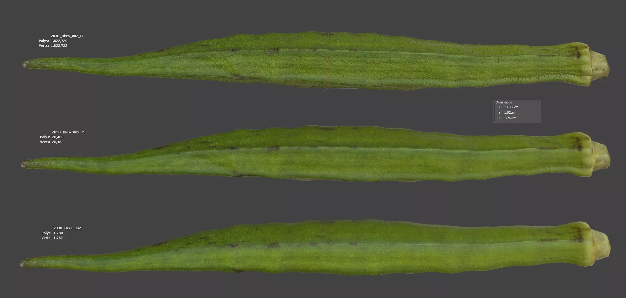 Enhance your food visualizations, product designs, or still-life projects with this ultra-realistic 3D okra model. Meticulously photogrammetry scanned and textured, it boasts multiple levels of detail (1K, 28K, 1822K polycounts) for close-ups and broader scenes.