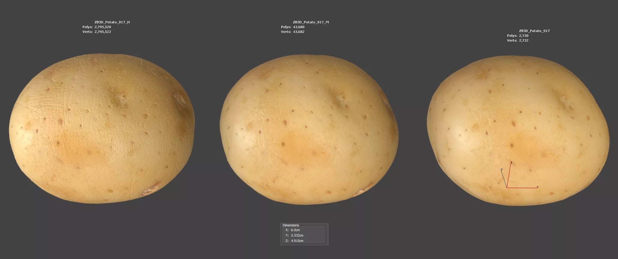 Enhance your food visualizations, product designs, or still-life projects with this ultra-realistic 3D fresh potato model. Meticulously photogrammetry scanned and textured, it boasts multiple levels of detail (2K, 43K, 2795K polycounts) for close-ups and broader scenes.