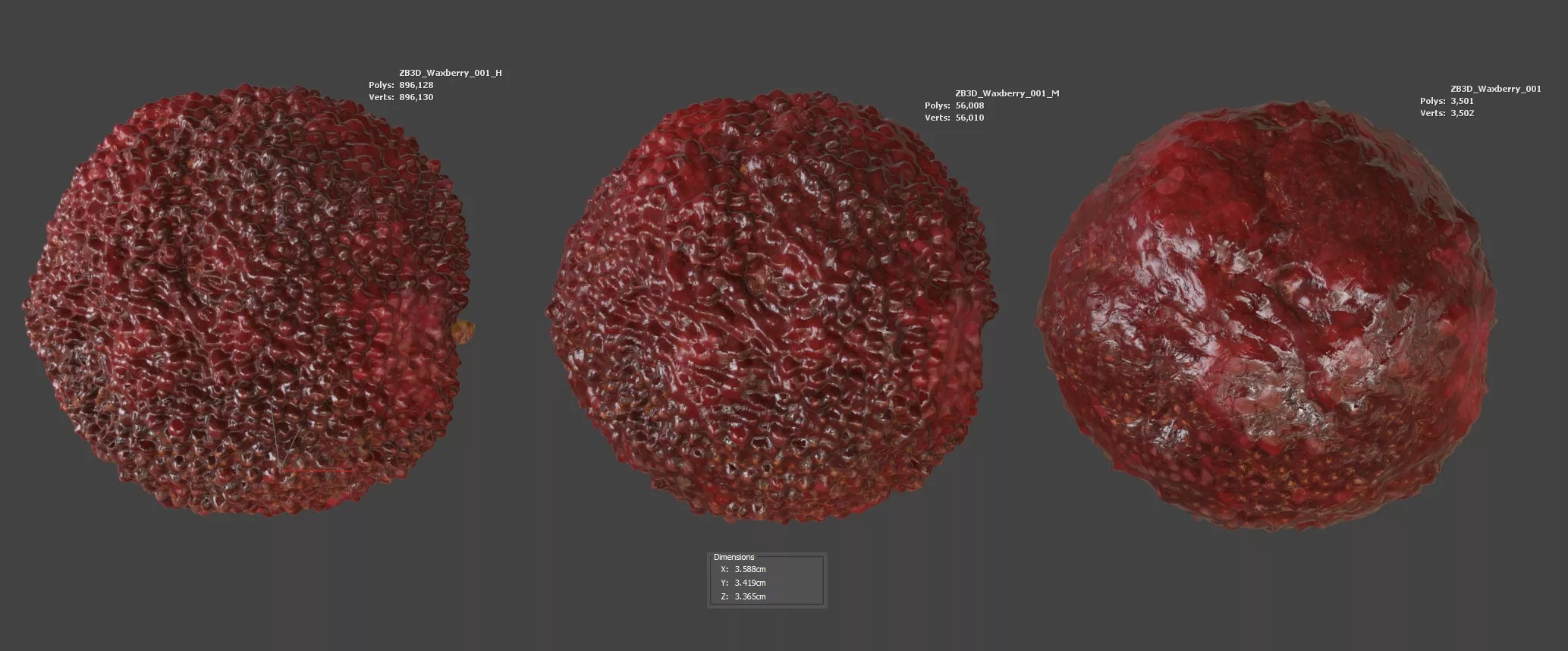 Enhance your food visualizations, product designs, or still-life projects with this ultra-realistic 3D waxberry model. Meticulously photogrammetry scanned and textured, it boasts multiple levels of detail (3K, 56K, 896K polycounts) for close-ups and broader scenes.