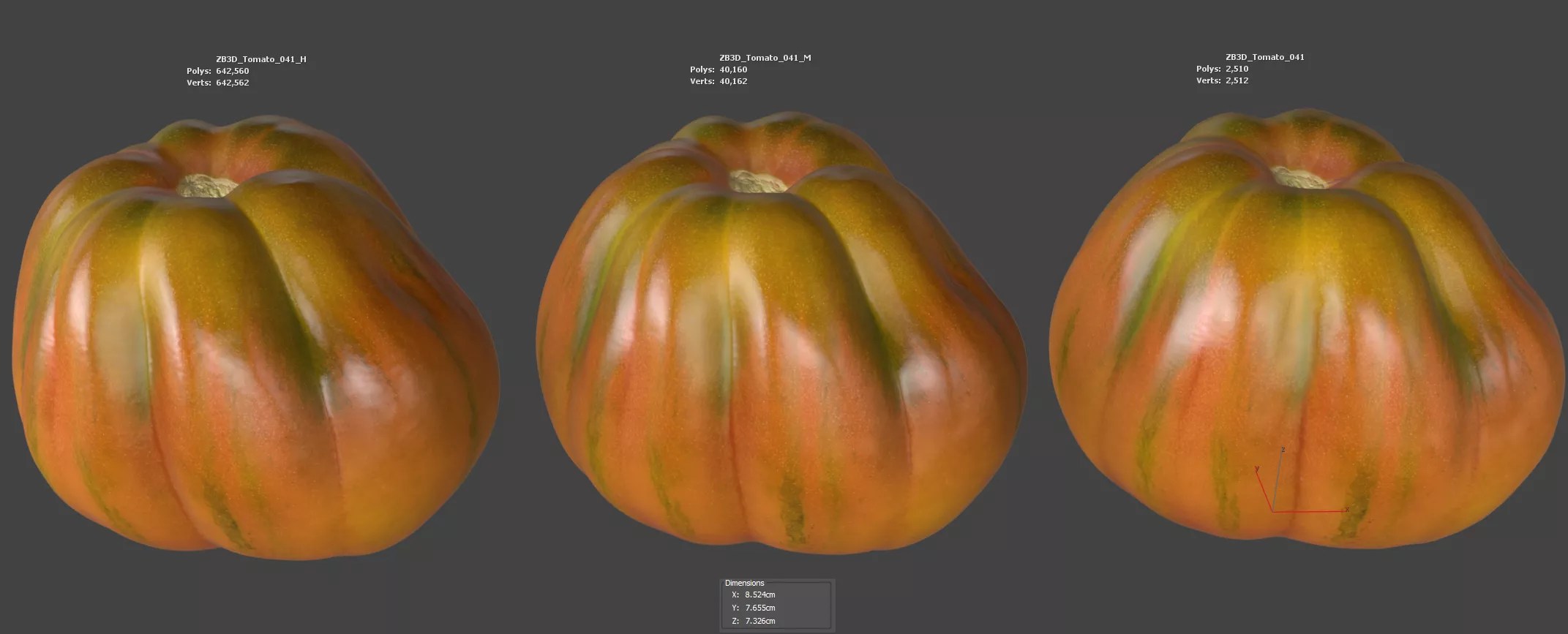 Enhance your visualizations, product designs, or still-life projects with this ultra-realistic 3D tomato model. Meticulously photogrammetry scanned and textured, it boasts multiple levels of detail (2K, 40K, 642K polycounts) for close-ups and broader scenes.