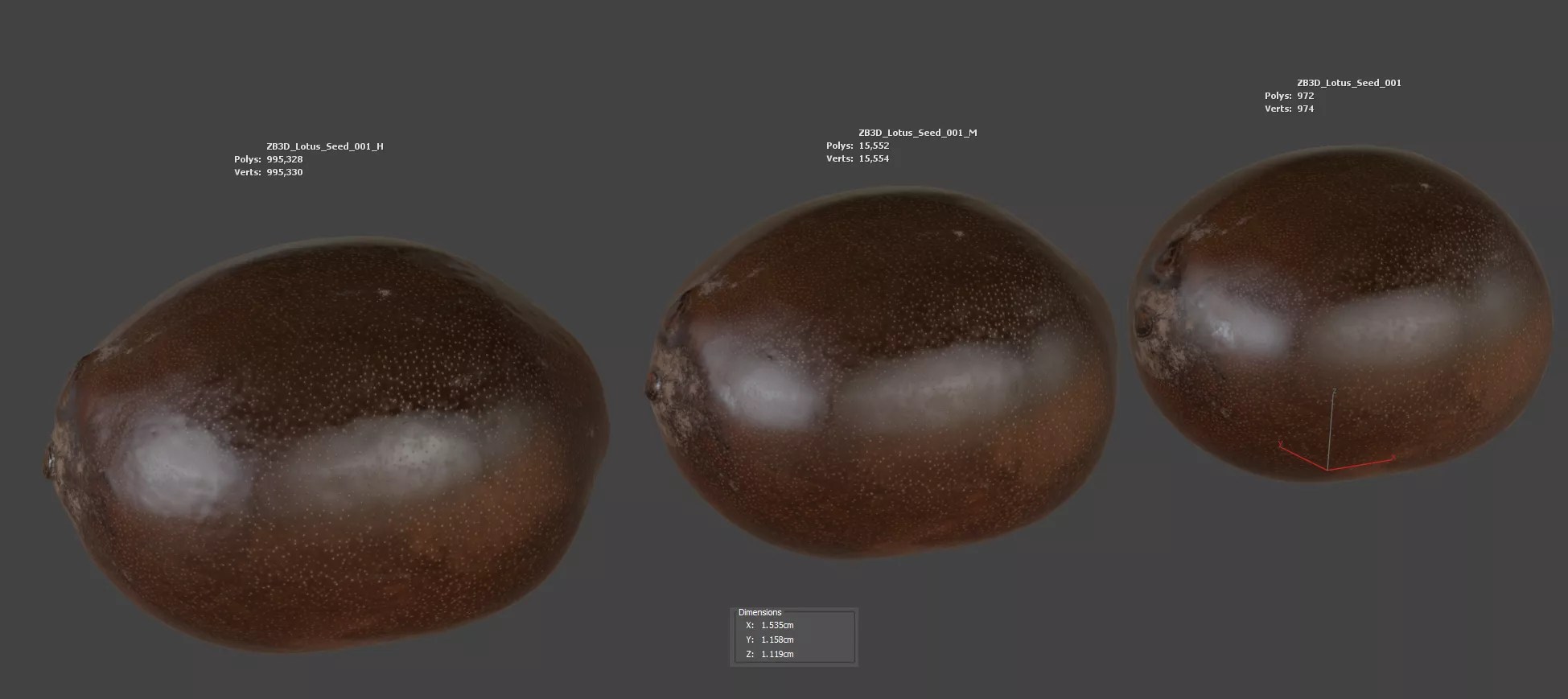 Enhance your visualizations, product designs, or still-life projects with this ultra-realistic 3D lotus seed model. Meticulously photogrammetry scanned and textured, it boasts multiple levels of detail (972, 15K, 995K polycounts) for close-ups and broader scenes.