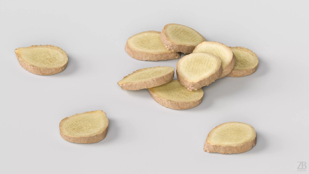 Ginger slice 3D model is available here: https://www.cgtrader.com/3d-models/food/miscellaneous/ginger-005