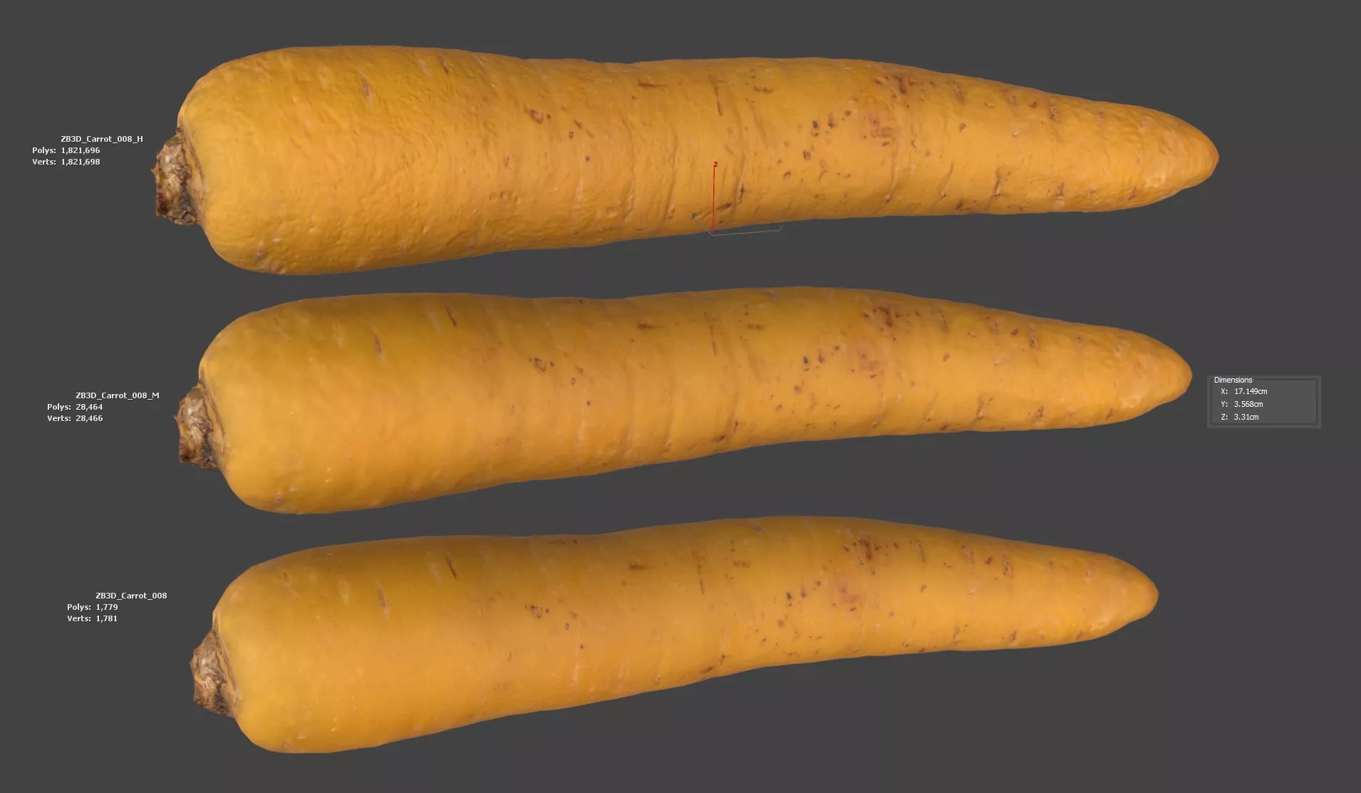 Enhance your visualizations, product designs, or still-life projects with this ultra-realistic 3D carrot model. Meticulously photogrammetry scanned and textured, it boasts multiple levels of detail (2K, 28K, 1821K polycounts) for close-ups and broader scenes.