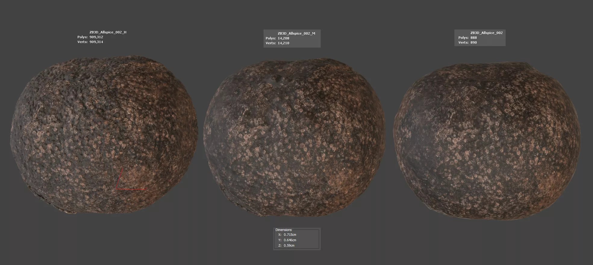 Enhance your visualizations, product designs, or still-life projects with this ultra-realistic 3D allspice model. Meticulously photogrammetry scanned and textured, it boasts multiple levels of detail (888, 14K, 909K polycounts) for close-ups and broader scenes.