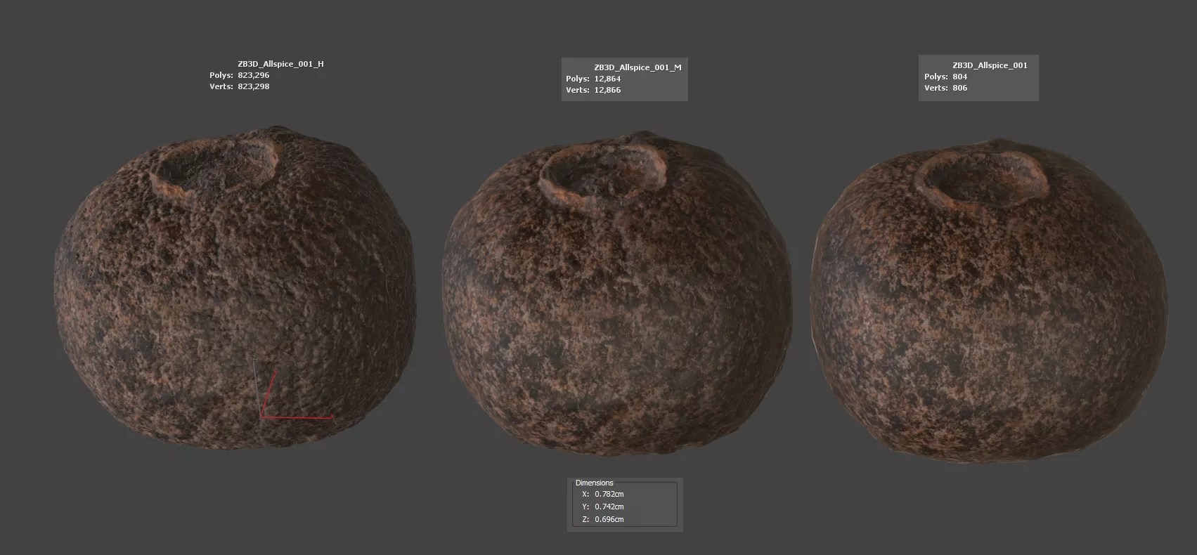 Enhance your visualizations, product designs, or still-life projects with this ultra-realistic 3D allspice model. Meticulously photogrammetry scanned and textured, it boasts multiple levels of detail (804, 12K, 823K polycounts) for close-ups and broader scenes.