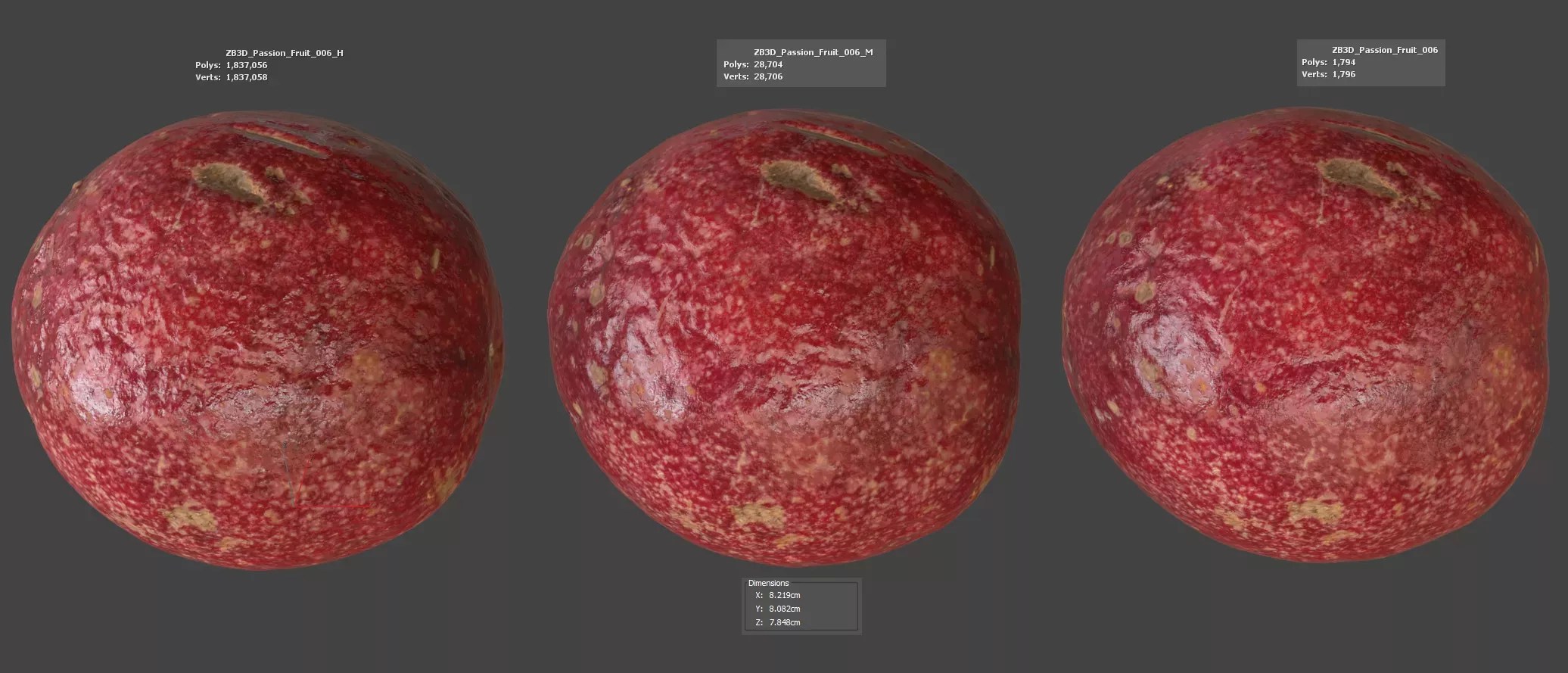Enhance your visualizations, product designs, or still-life projects with this ultra-realistic 3D passion fruit model. Meticulously photogrammetry scanned and textured, it boasts multiple levels of detail (2K, 28K, 1837K polycounts) for close-ups and broader scenes.