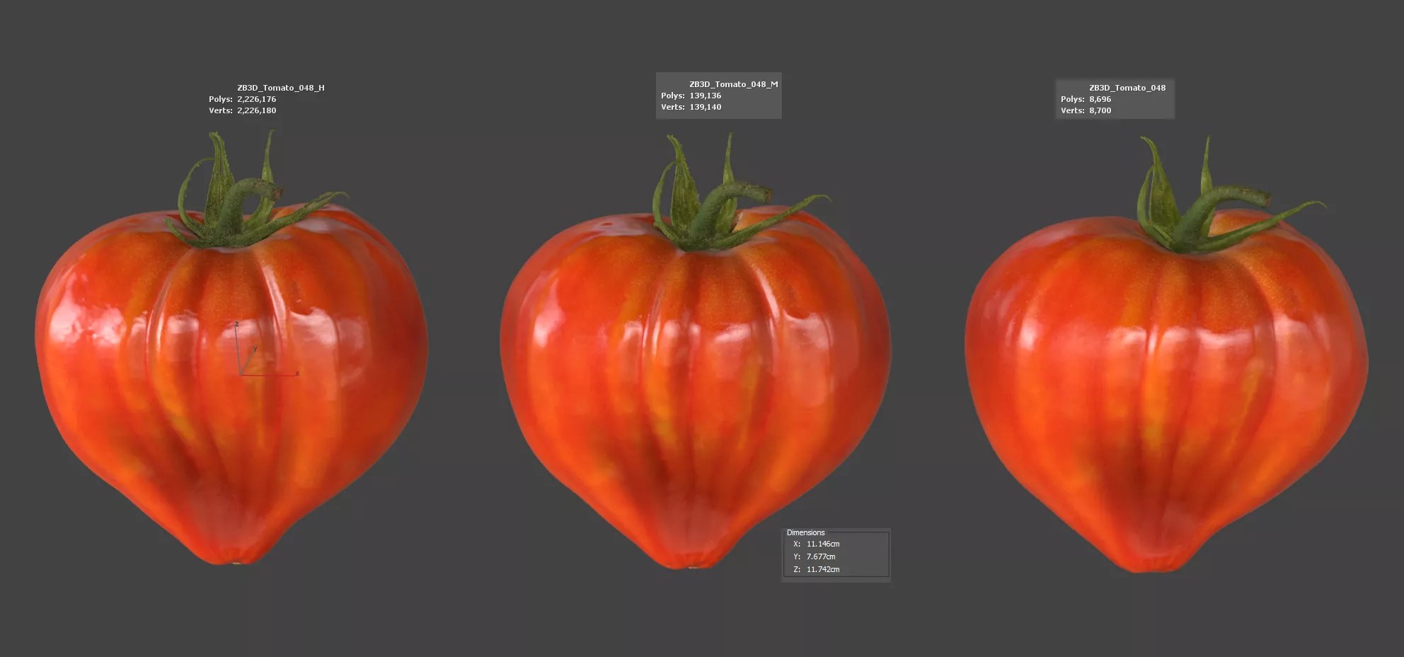 Enhance your visualizations, product designs, or still-life projects with this ultra-realistic 3D tomato model. Meticulously photogrammetry scanned and textured, it boasts multiple levels of detail (2K, 139K, 2226K polycounts) for close-ups and broader scenes.