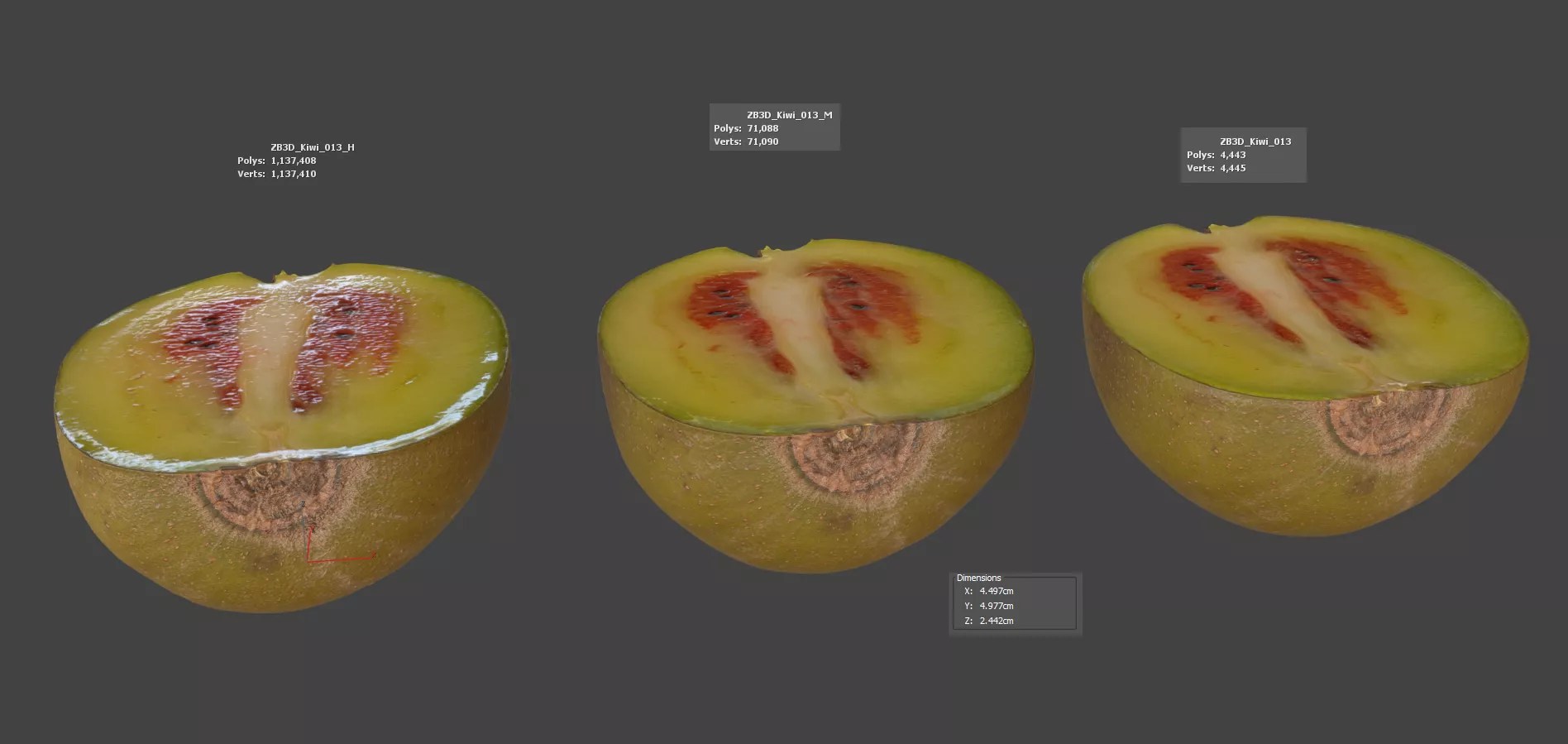 Enhance your visualizations, product designs, or still-life projects with this ultra-realistic 3D red kiwi model. Meticulously photogrammetry scanned and textured, it boasts multiple levels of detail (4K, 71K, 1137K polycounts) for close-ups and broader scenes.