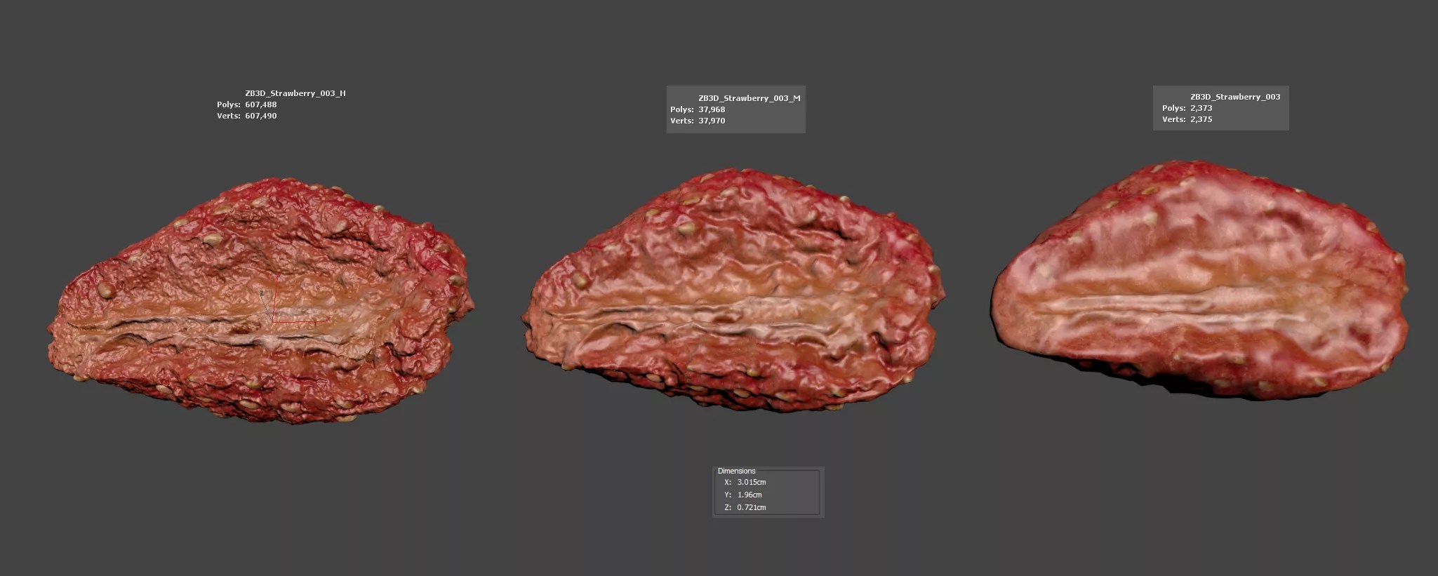Enhance your visualizations, product designs, or still-life projects with this ultra-realistic 3D strawberry model. Meticulously photogrammetry scanned and textured, it boasts multiple levels of detail (2K, 37K, 607K polycounts) for close-ups and broader scenes.