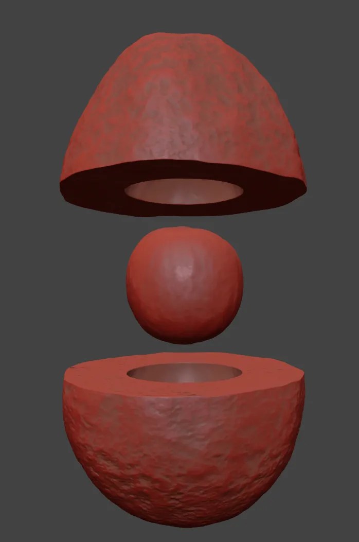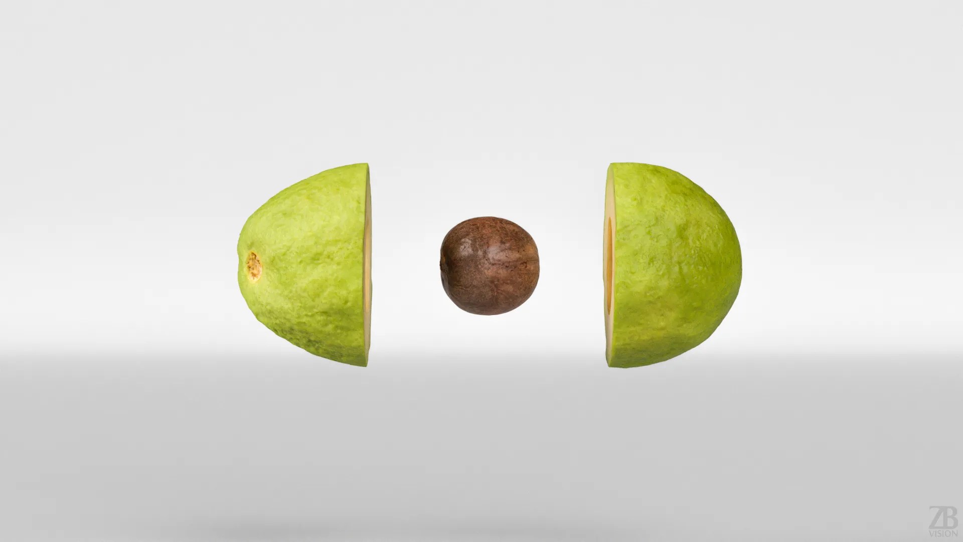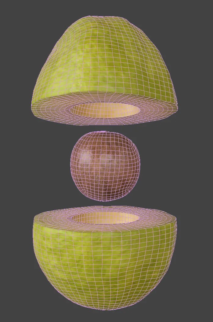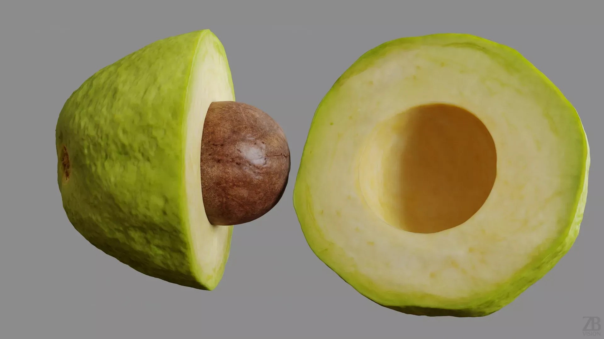 Photorealistic 3D peeled avocado model, 2 halves and a seed