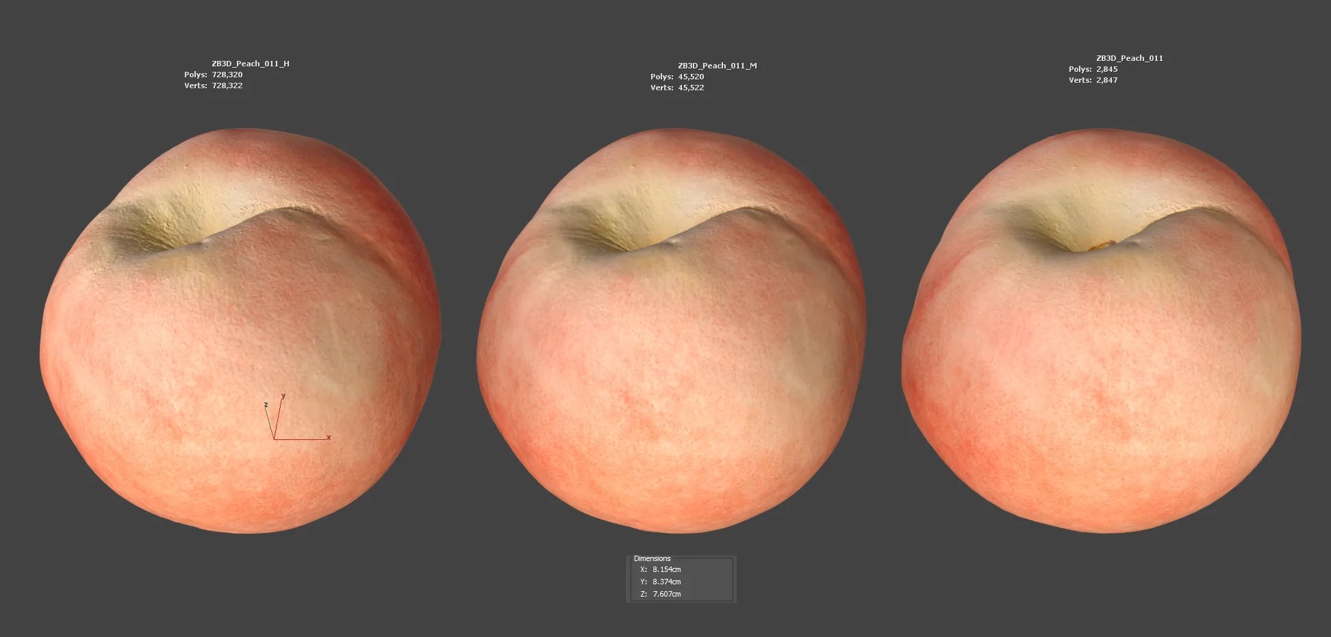 Enhance your visualizations, product designs, or still-life projects with this ultra-realistic 3D peach model. Meticulously photogrammetry scanned and textured, it boasts multiple levels of detail (2K, 45K, 728K polycounts) for close-ups and broader scenes.