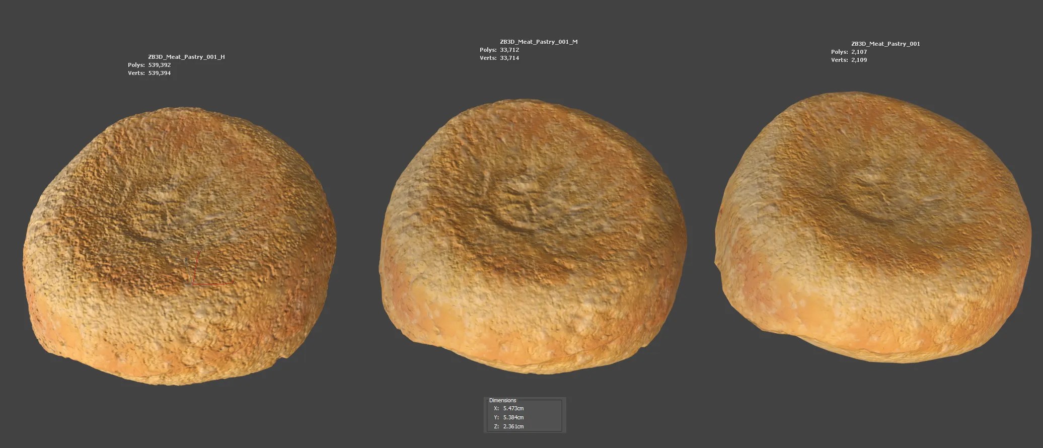Enhance your visualizations, product designs, or still-life projects with this ultra-realistic 3D meat pastry model. Meticulously photogrammetry scanned and textured, it boasts multiple levels of detail (2K, 33K, 539K polycounts) for close-ups and broader scenes.