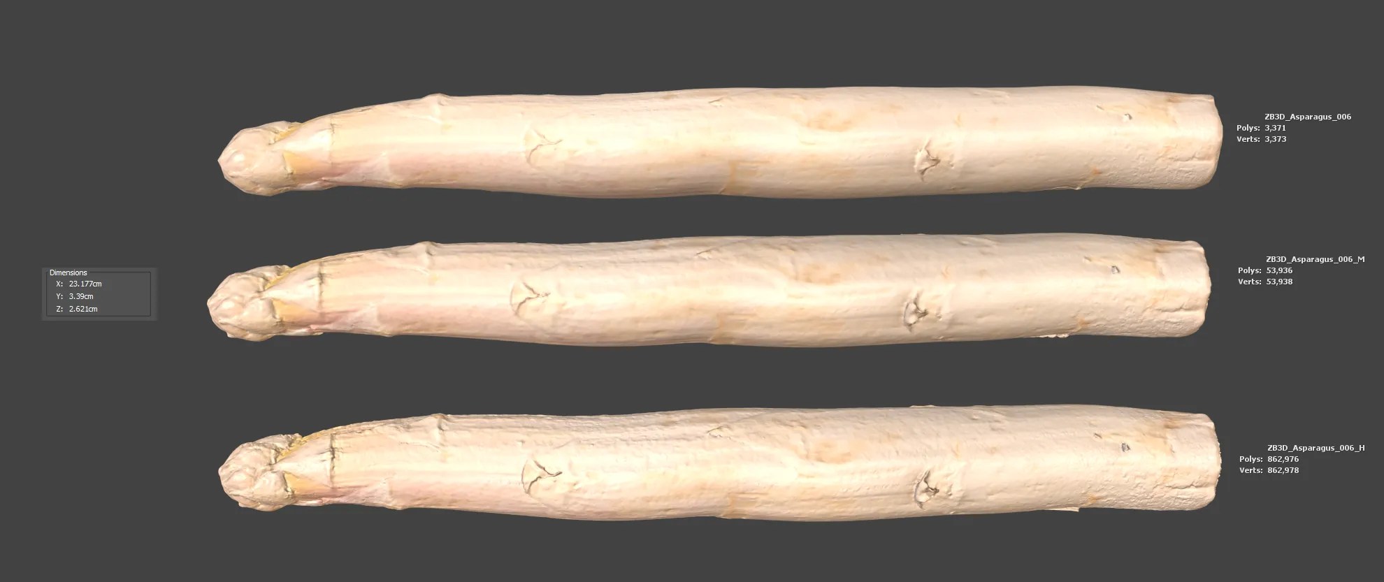 Enhance your visualizations, product designs, or still-life projects with this ultra-realistic 3D asparagus model. Meticulously photogrammetry scanned and textured, it boasts multiple levels of detail (3K, 53K, 862K polycounts) for close-ups and broader scenes.