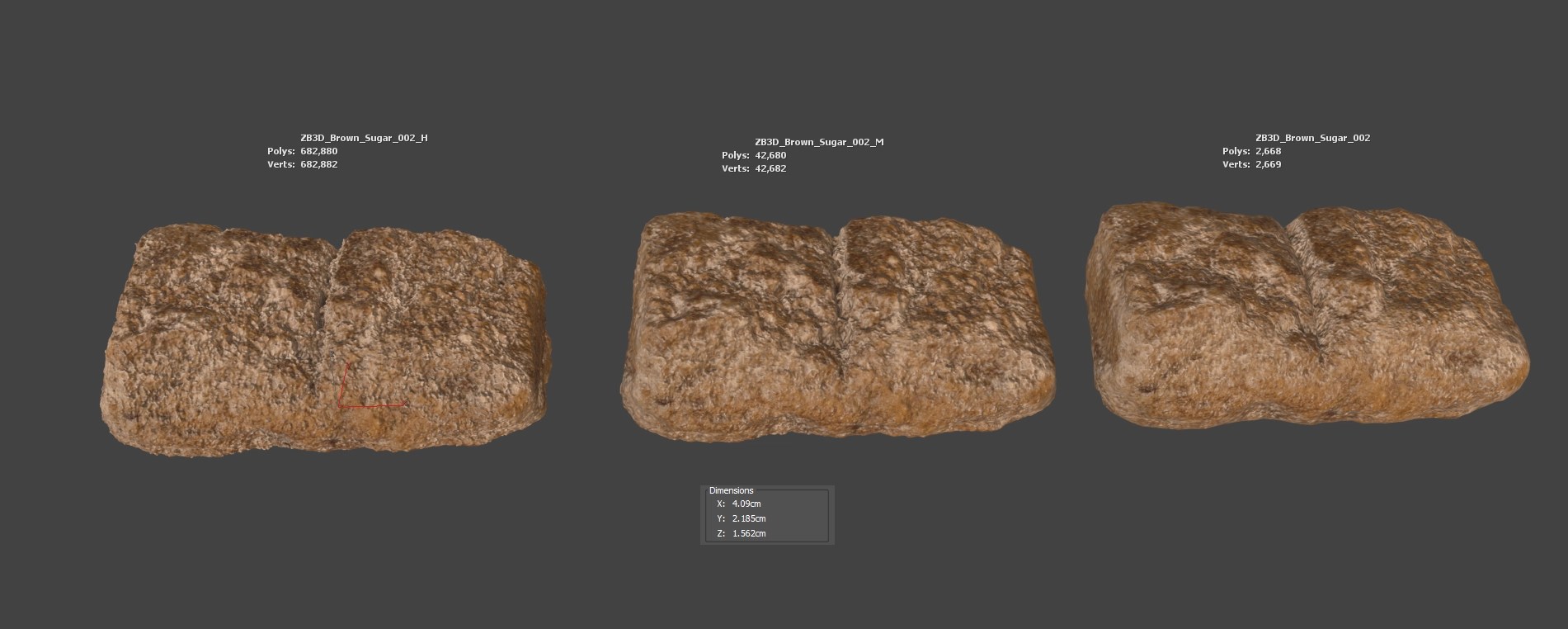 Enhance your visualizations, product designs, or still-life projects with this ultra-realistic 3D brown sugar cube model. Meticulously photogrammetry scanned and textured, it boasts multiple levels of detail (2K, 42K, 682K polycounts) for close-ups and broader scenes.