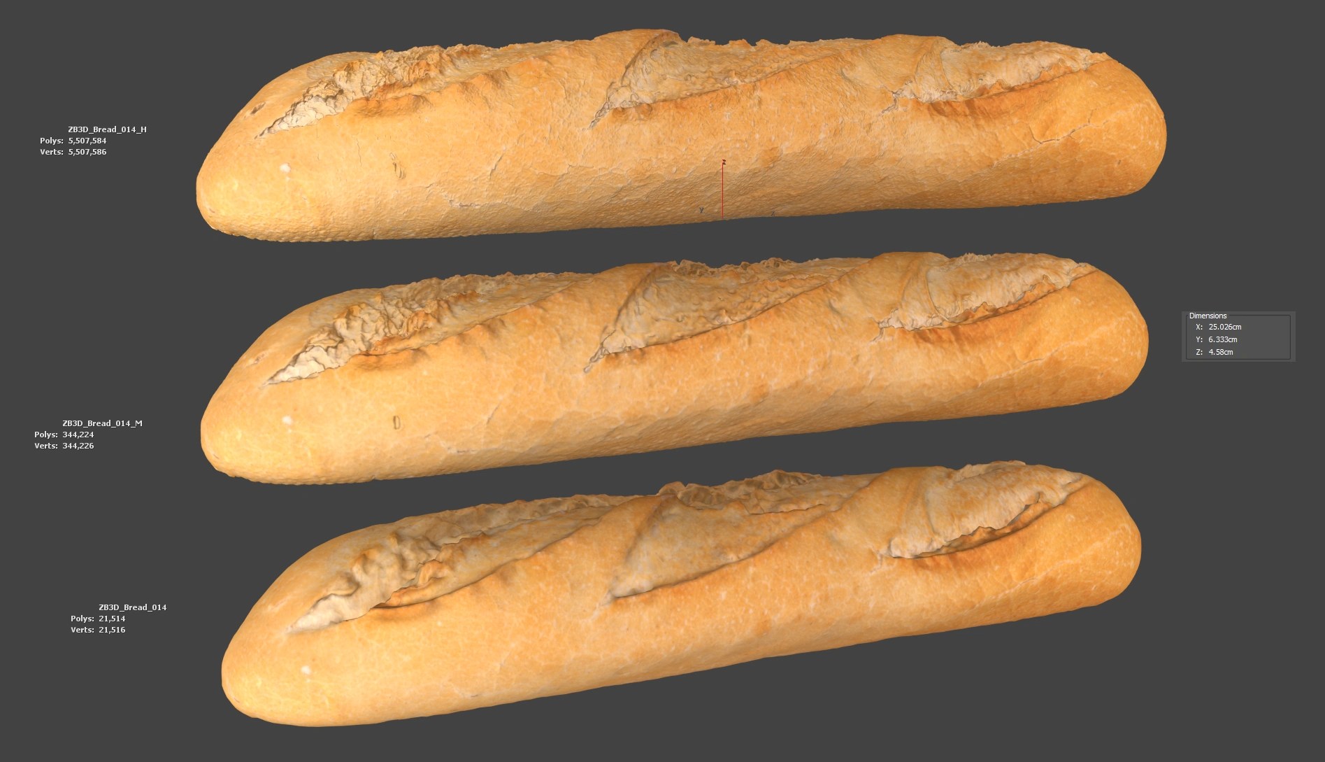 Enhance your visualizations, product designs, or still-life projects with this ultra-realistic 3D bread model. Meticulously photogrammetry scanned and textured, it boasts multiple levels of detail (21K, 344K, 5507K polycounts) for close-ups and broader scenes.