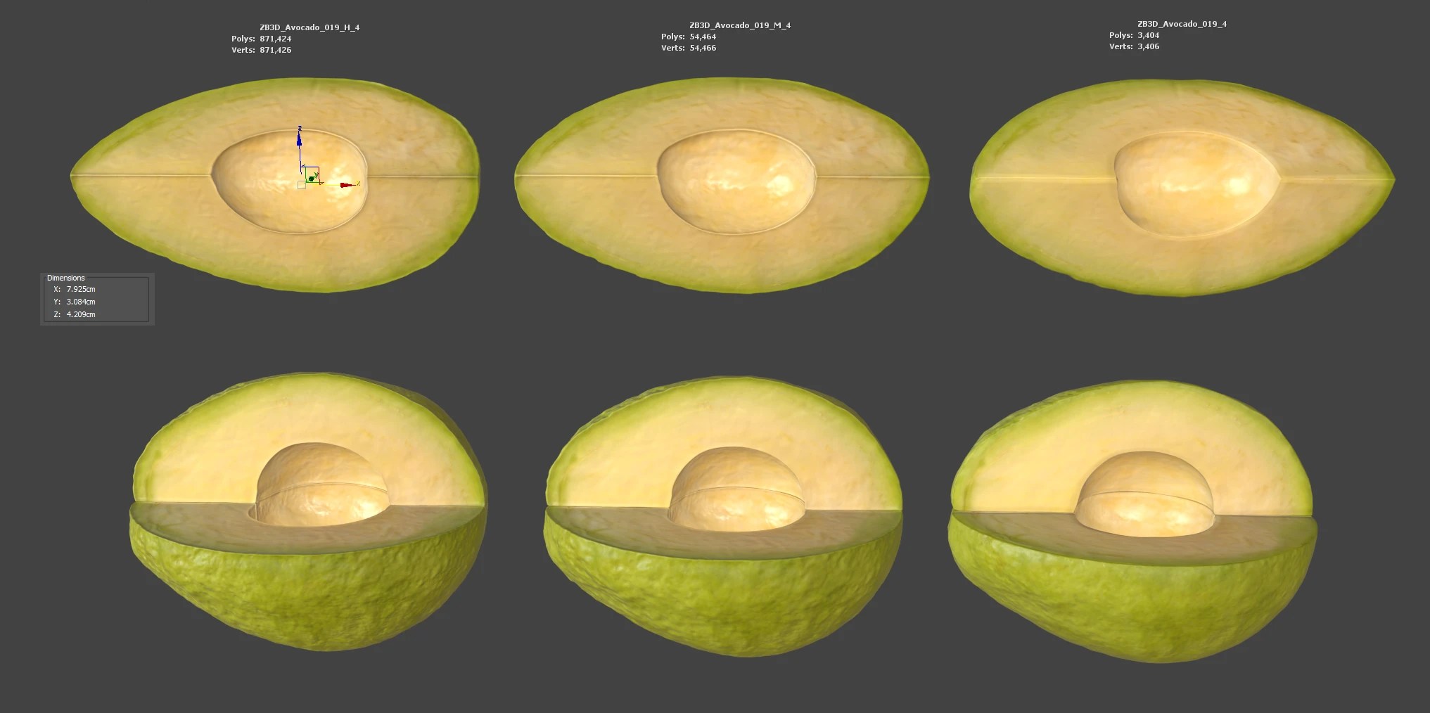 Enhance your visualizations, product designs, or still-life projects with this ultra-realistic 3D avocado model. Meticulously photogrammetry scanned and textured, it boasts multiple levels of detail for close-ups and broader scenes. Total count for all 4 pieces of each LoD – 13K, 215K, 3443K polys .