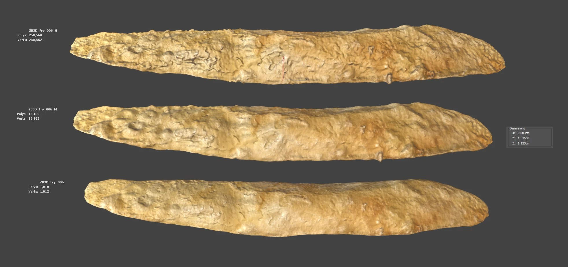 Enhance your visualizations, product designs, or still-life projects with this ultra-realistic 3D fry model. Meticulously photogrammetry scanned and textured, it boasts multiple levels of detail (1K, 16K,258K polycounts) for close-ups and broader scenes.