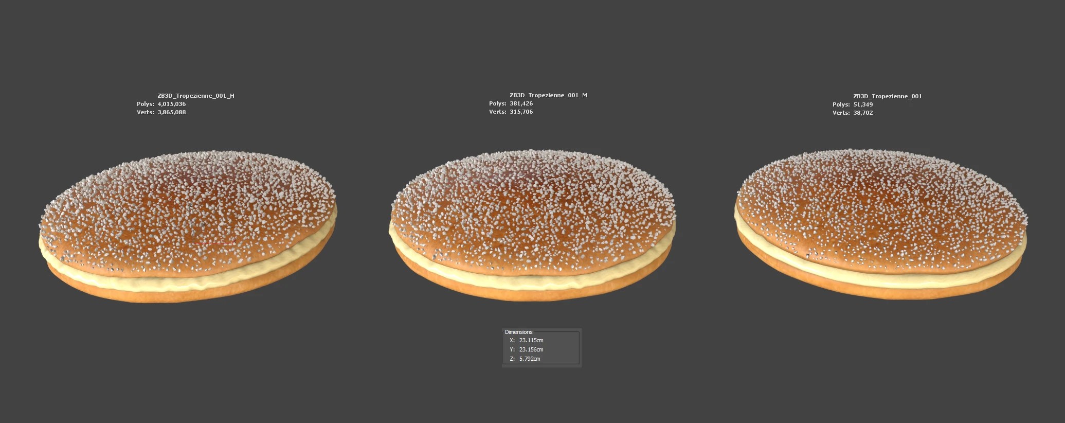 Enhance your visualizations, product designs, or still-life projects with this ultra-realistic 3D Tarte Tropézienne model. Meticulously photogrammetry scanned and textured, it boasts multiple levels of detail (51K, 381K, 4015K polycounts) for close-ups and broader scenes.