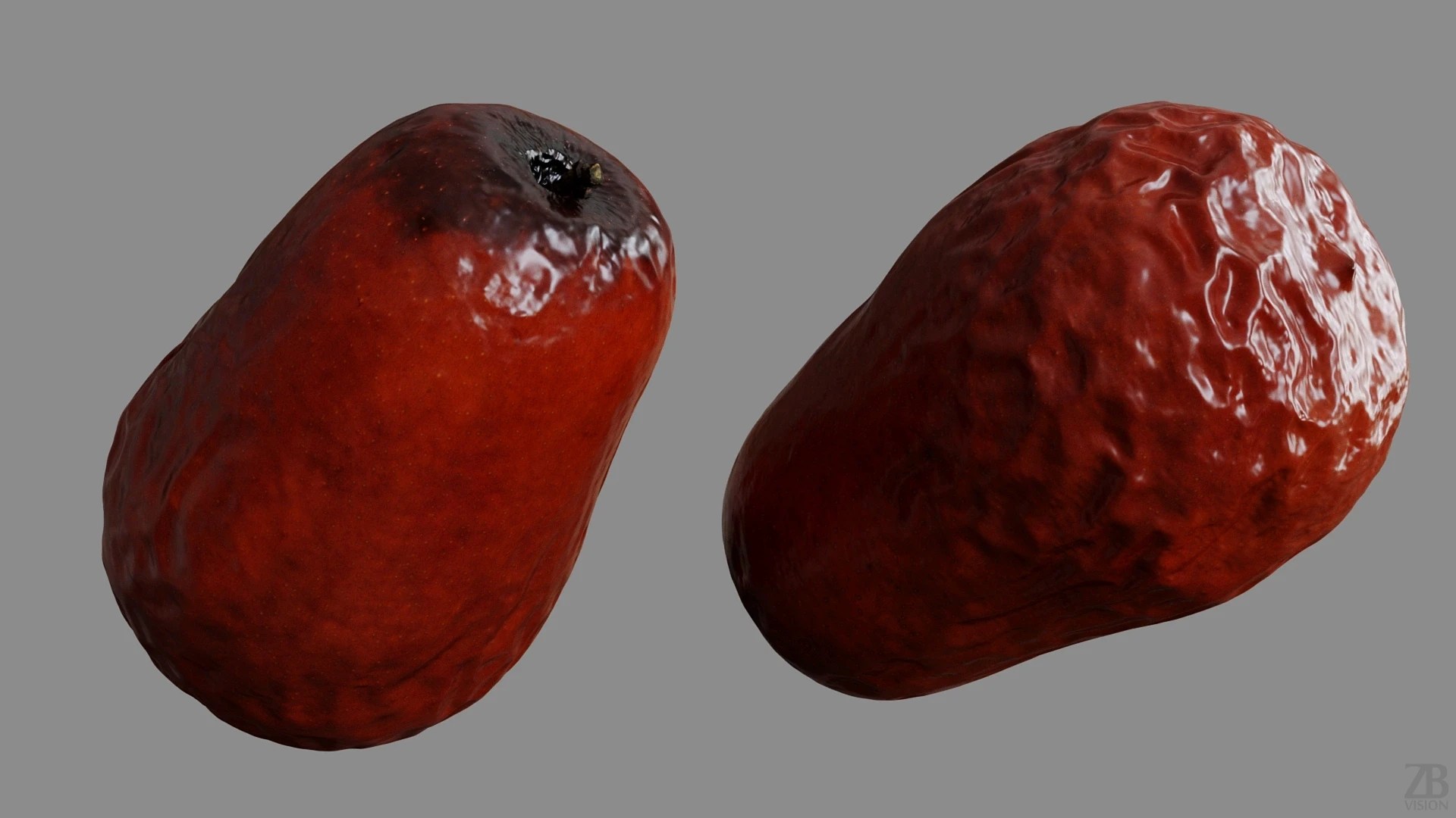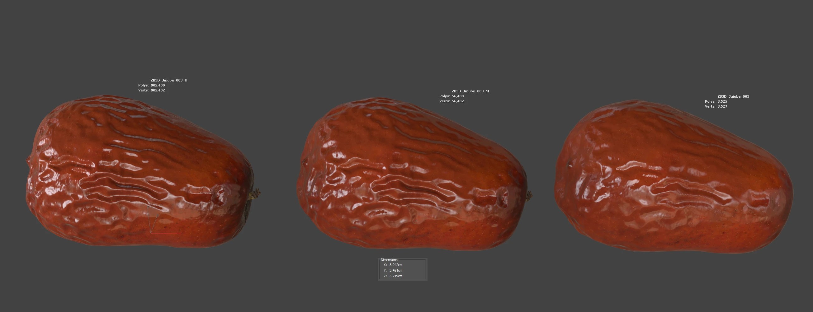 Enhance your visualizations, product designs, or still-life projects with this ultra-realistic 3D jujube model. Meticulously photogrammetry scanned and textured, it boasts multiple levels of detail (3K, 56K, 902K polycounts) for close-ups and broader scenes.