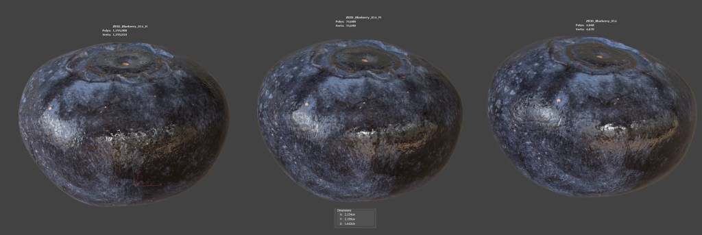 Enhance your visualizations, product designs, or still-life projects with this ultra-realistic 3D blueberry model. Meticulously photogrammetry scanned and textured, it boasts multiple levels of detail (4K, 74K, 1195K polycounts) for close-ups and broader scenes.
