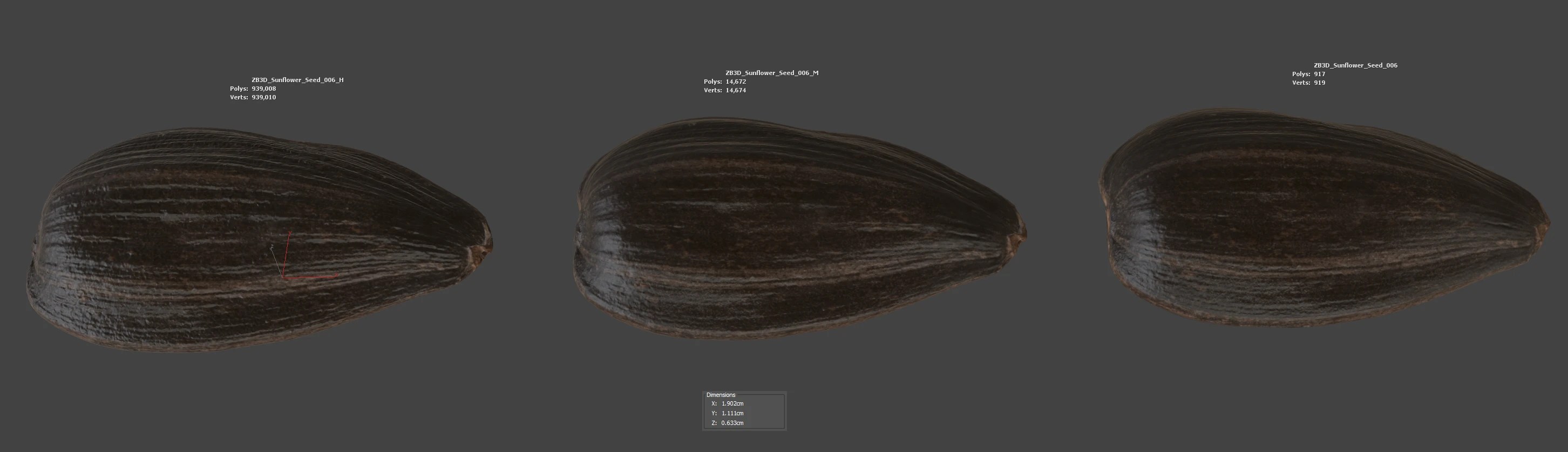 Enhance your visualizations, product designs, or still-life projects with this ultra-realistic 3D sunflower seed model. Meticulously photogrammetry scanned and textured, it boasts multiple levels of detail (917, 14K, 939K polycounts) for close-ups and broader scenes.