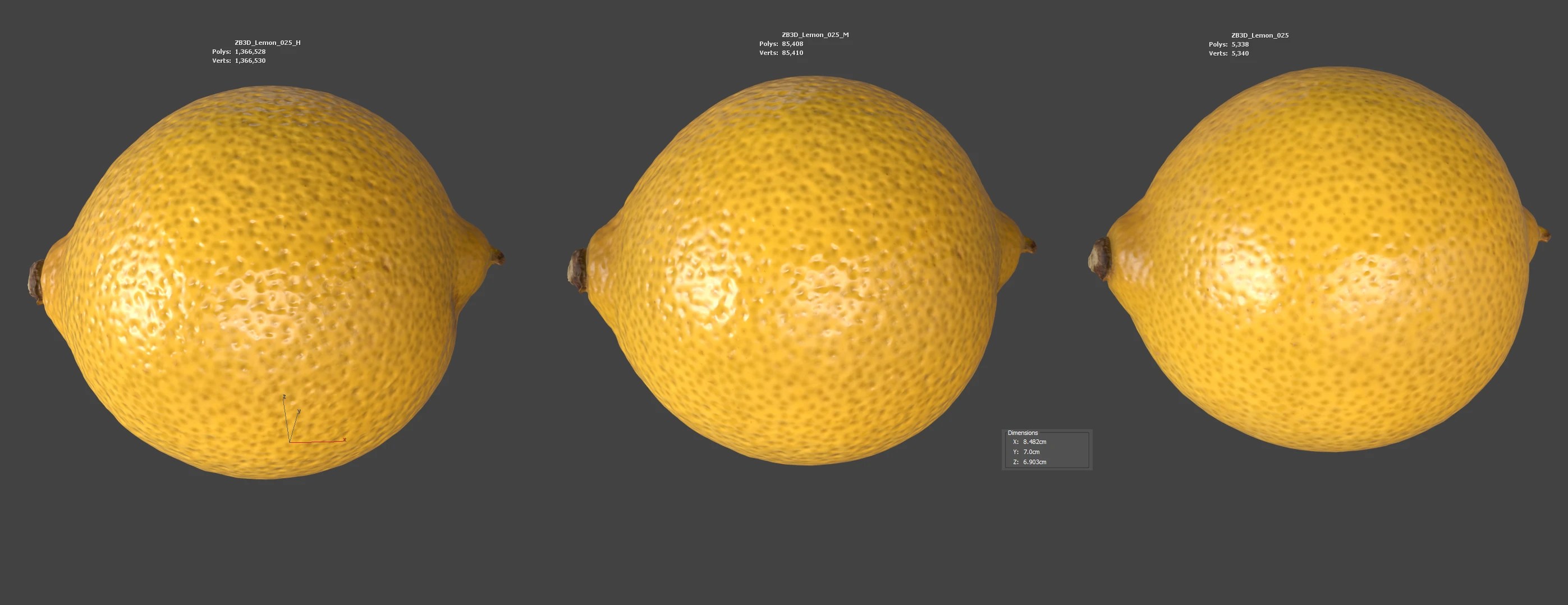 Enhance your visualizations, product designs, or still-life projects with this ultra-realistic 3D lemon model. Meticulously photogrammetry scanned and textured, it boasts multiple levels of detail (5K, 85K, 1366K polycounts) for close-ups and broader scenes.