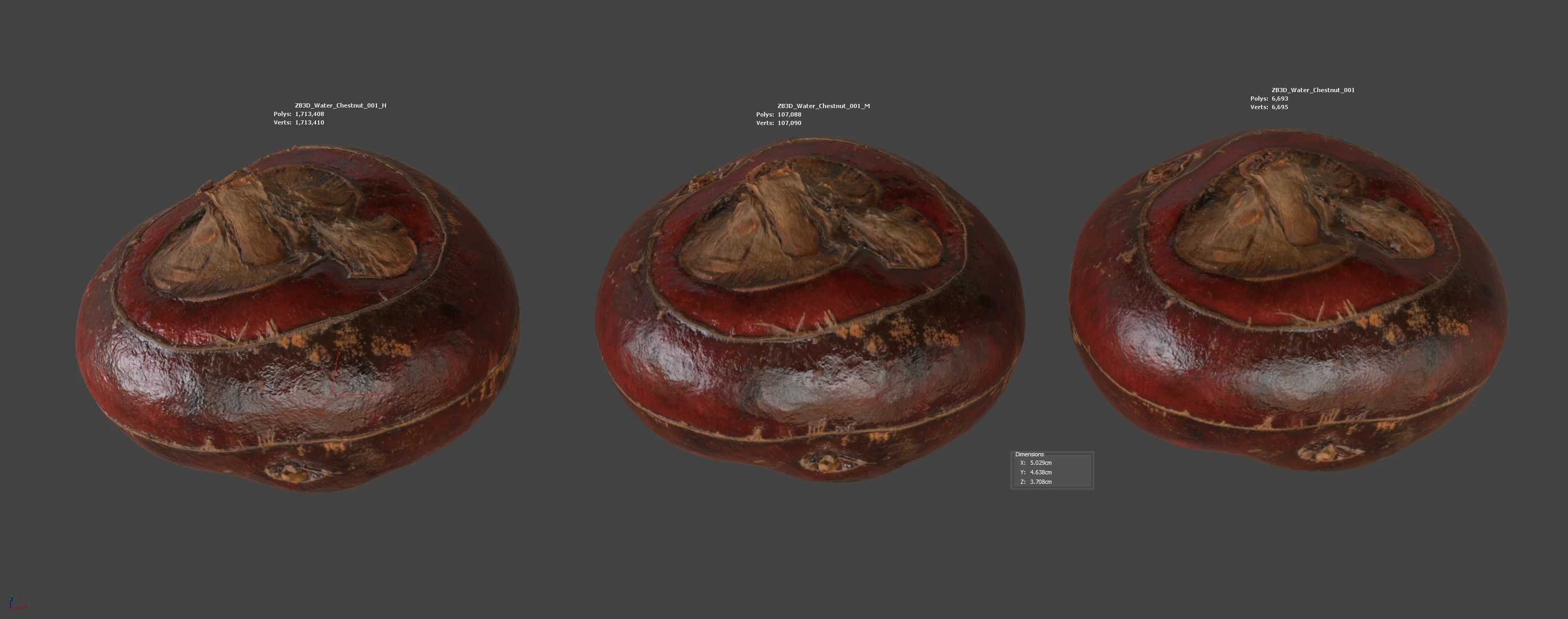Enhance your visualizations, product designs, or still-life projects with this ultra-realistic 3D water chestnut model. Meticulously photogrammetry scanned and textured, it boasts multiple levels of detail (6K, 107K, 1713K polycounts) for close-ups and broader scenes.